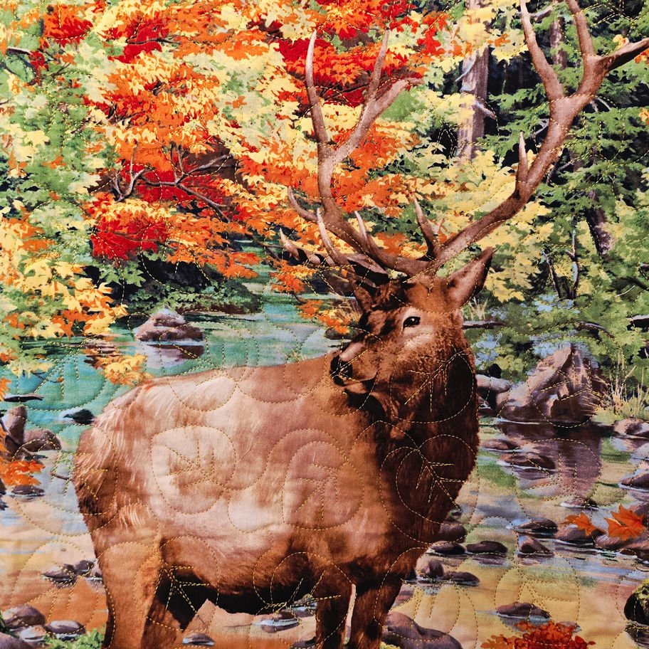 This quilt features wildlife and fall leaves on burgundy, red and green flannel swatches. It measures 41 x 62 inches and was made by Marie.